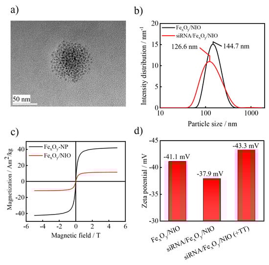(a) Representative TEM image of FexOy/NIO (measured at 200 kV), (b) DLS result of plain FexOy/NIOs and siRNA/FexOy/NIOs, (c) magnetic behavior of the synthesized FexOy-NPs and FexOy/NIOs at 300 K determined by a superconducting quantum interference device (SQUID) magnetometer as well as (d) zeta potential measurements of plain FexOy/NIOs, siRNA/FexOy/NIOs and siRNA/FexOy/NIOs after trypsin treatment (+TT).