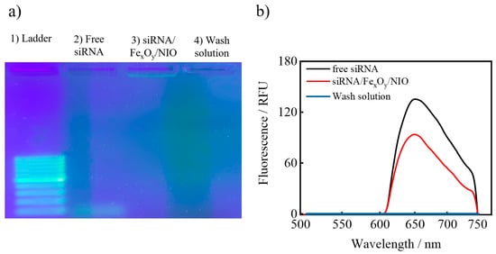 (a) Stained agarose gel after electrophoresis of the (1) ladder, (2) free siRNA, (3) siRNA/FexOy/NIOs and (4) wash solution; (b) fluorescence spectrum of SYBR Green I-stained free siRNA, siRNA/FexOy/NIO and the wash solution.