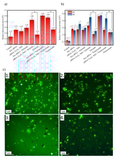 Apoptotic effect determined via (a) caspase 3/7 cleavage activity (without magnetic treatment) and (b) intracellular Ca2+ concentration of free siRNA, siRNA/FexOy/NIO, free siRNA with anti-tumor agent, siRNA/FexOy/NIO with anti-tumor agent and free anti-tumor agent with (M+) and without (M-) magnetic treatment (* = the values of the samples containing siRNA/FexOy/NIO + anti-tumor agent and the value of the respective anti-tumor agent were analyzed using a t-test, with all data showing p < 0.05 considered significant); (c) representative fluorescent images (using the Calbryte-520 Assay Kit) showing occurring apoptosis (light green) of BT-474 cells after administration of (1) siRNA/FexOy/NIO with erlotinib, (2) free siRNA with erlotinib, (3) erlotinib and (4) control cells and a subsequent magnetic treatment.