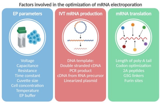Since the early experimental application of electric pulses in the field of medicine during the eighteenth century, electroporation has become a universal method for transfecting biological and synthetic compounds into an array of prokaryotic and eukaryotic cells for a wide number of purposes [1]. Electroporation, also called electropermeabilization, is defined as the application of voltage pulses that generate an electric field between two electrodes that disrupts the integrity of a cell membrane, allowing the formation of pores. It was first developed as an irreversible process of pore formation that did not allow recovery of the cell membrane, therefore resulting in cell death [1] Reversible electroporation was introduced in 1957 by Stämpfli and Willi [2], but it was not until 1982 that this type of electroporation was described for the transfection of genetic material [3]. In that article, Neumann et al., who also coined the term “electroporation”, described how electric pulses enhanced the uptake of extracellular DNA into mouse cells [3]. Since then, the versatility of this technique has been demonstrated in multiple cell types and organisms for the transfection of various molecules in a wide range of applications. The field of cell-based immunotherapy in particular has made enormous progress due to the development and optimization of messenger RNA (mRNA) electroporation for gene transfer. This type of genetic engineering, compared to that of the viral delivery of genes, represents a safer alternative for protein expression with no risk of insertional mutagenesis and lower immunogenicity [4,5]. The superiority of mRNA electroporation over passive pulsing or lipofection of mRNA, and even over plasmid DNA electroporation, in terms of efficiency of gene delivery was demonstrated by our group two decades ago [6,7]. In contrast to plasmid DNA electroporation, transient gene expression linked to the natural decay of introduced mRNA provides an accurate system to control the synthesis of exogenous proteins. The main factors involved in successful mRNA electroporation for gene transfer can be divided into three main categories, (i) electroporation parameters, (ii) variables of in vitro mRNA synthesis, and (iii) elements used to enhance transfected mRNA stability and transgene expression (Figure 1). In this review, we discuss the different parameters marking mRNA electroporation and how to implement them as well as the factors involved in the production of clinical-grade mRNA for electroporation in the context of cell-based immunotherapies.