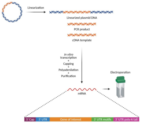 For mRNA electroporation in gene transfer studies, one of the key factors at the molecular level for efficient and correct protein expression is the synthesis of the mRNA. In eukaryotic cells, the first step of gene expression occurs in the nucleus and consists of the transcription of an mRNA strand from a segment of complementary DNA (cDNA) by RNA polymerase II. Before being transported to the cytoplasm to be translated into protein, the precursor mRNAs (pre-mRNAs) undergo a maturation process in the nucleus that includes modification of the 5′ and 3′ ends and elimination of the non-coding regions (introns). The first modification occurs at the 5′ region where a methylated guanosine or “cap” is added to the first nucleotide of the pre-mRNA, protecting it from degradation by exonucleases [22]. Next, polyadenylation takes place at the 3′ terminus of the pre-mRNA [23]. Finally, the introns are removed from the pre-mRNA through splicing, leaving a mature mRNA consisting of the protein-coding regions (exons) flanked by untranslated regions (UTRs), the methylated guanosine cap, and a poly(A) tail.