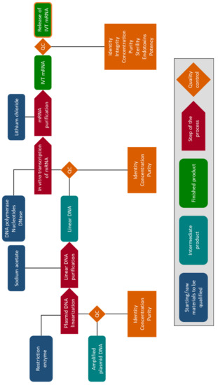Example of the messenger RNA production processes and quality control testing for the release of IVT mRNA in a clinical setting for human use. Generally, different reagents, raw materials, and intermediate products are needed to produce any in vitro transcribed (IVT) mRNA. However, compared to research-grade mRNA, manufacture, and final release of IVT mRNA for clinical use in humans usually requires more quality controls (QC). These controls include the quantification of the mRNA concentration, purity, and integrity, but also the confirmation of the identity the mRNA, its sterility, its potency, and the absence of potentially damaging endotoxins.