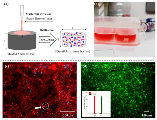 Cell viability in scaffolds was detected by fluorescence live/dead assay (Calcein AM solution (Cat. no C1359) and Ethidium homodimer I solution (Cat. no E1903), Sigma-Aldrich, Milan, Italy), immediately after making scaffold. Cells were stained for 1 h at 37 °C, washed in PBS 1× and imaged in a fluorescence microscope (mod. Eclipse, Nikon Corporation, Tokyo, Japan).