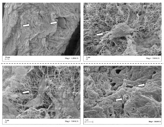 Freeze-dried scaffold observed by a Scanning Electron Microscope at different enlargements. The scaffold structure is formed by a network of fibers with inside cells distributed (a); collagen fibers are organized in randomly assembled web in which cells were clearly observed (arrowheads) (b,c); PLGA carriers are embedded within the collagen fibers (arrowheads with white circle) (d).