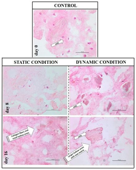 The collagen scaffold does not undergo any rearrangement or degradations during 16 days without cells cultured within, even if maintained in culture medium; furthermore, no changes in scaffold porosity, volume or color was monitored in absence of cell culture (data not shown). On the contrary, the same scaffold loaded with hBM-MSC underwent a change of its volume (reduced by 1/3) and color (whiter) after 16 days. Histological evaluation by H&E staining was applied to determine changes to the scaffold composition and structure during extended culture. At day zero, cells were homogeneously distributed within the hydrogel matrix and which itself appeared randomly assembled (Figure 5). The 3D collagen matrix maintained its integrity during the static culture and even at day 16 only small hollow areas were observed; conversely, the matrix surrounding the cells underwent a greater extent of remodeling in the dynamic regime, and distinct and novel regions deposition were also noted for cell-rich regions (see Figure 5, day 8 and 16 in dynamic conditions). This behavior was also confirmed by polarized microscope observation of the Sirius red-stained samples illustrated in Figure 6. The collagen synthetic fibers (in red) are evident along the culture evolution; however, they were progressively reshaped by the cells and several hollow areas appeared filled with darker red areas in where cells are clearly evident. These new matrix areas are more abundant in the dynamic culture and supposed to be new collagen, even if the fibers within appeared not yet organized.