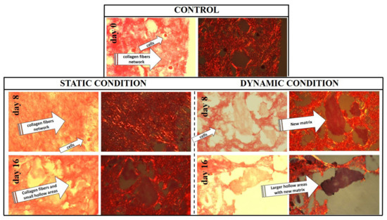 Polarized microscope images of 3D bioengineered scaffold stained by Sirius red. The collagen synthetic matrix is represented by network fibers stained in light red. This collagen matrix underwent a progressive degradation that was larger and more abundant in dynamic culture conditions. Furthermore, we observed new matrix deposition (darker red areas) within the hollow areas of the scaffold, but mainly at day 16 in the scaffold cultured in perfusion.). All images are obtained using an enlargements of 40×.
