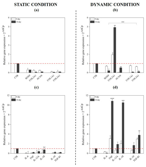 Gene expression profiling of chondrogenic markers and cytokines in static and dynamic culture conditions. The mRNA expression levels of positive and negative chondrogenic markers (COL1A1, COL2A1, COL3A1, SOX9 and ACAN) and cytokines (IL-6, TNF, IL-12A, IL-1β, IL-10 and TGF-β1) were monitored using a RT-qPCR; untreated cells were used as control. In static condition, all investigated genes were downregulated compared to the control (a,c). In contrast, COL2A1 mRNA levels showed, in dynamic culture, a significant upregulation (4.9-fold) at day 16 (b), as well as proinflammatory cytokines TNF and IL-1β (10-fold) and anti-inflammatory ones as IL-10 and TGF-β1 (2- and 3.8-fold changes) (d). * p < 0.05, ** p < 0.01, *** p < 0.001 and **** p < 0.0001 (two-way ANOVA, n = 3).