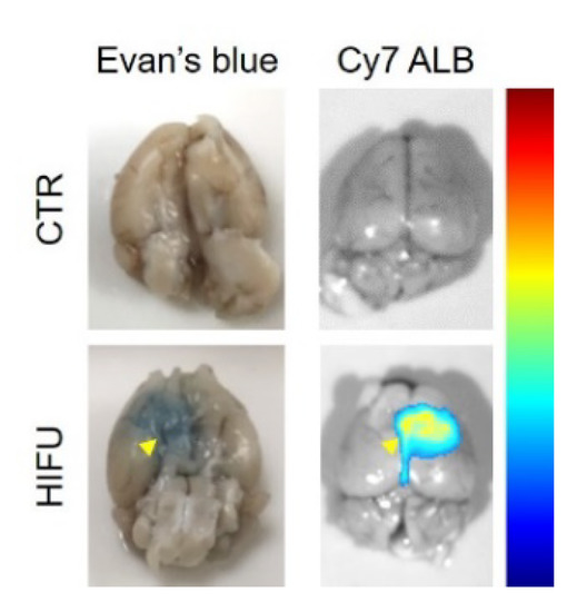 HIFU with microbubbles disrupts the BBB detected by accumulation of Evan’s blue (left panel) and Cy7-albumin (Cy7 ALB, right panel). Arrowhead, accumulation of Evan’s blue (EB) and Cy7-albumin (Cy7 ALB) in the brain of mice after HIFU.