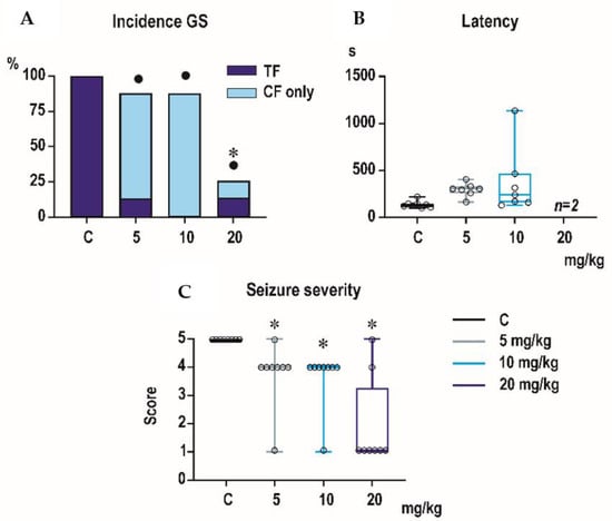 Minimal clonic seizures (mS) with preserved righting ability were seen in the ma-jority of P18 and P25 controls (Figure 2 and Figure 3). The incidence of these seizures was not sig-nificantly affected by any dose of PEAQX. PEAQX tended to increase latencies of mS in either age group (one-way RM ANOVA—F3,26 = 1.853, p = 0.162 and F3,26 = 2.05, p = 0.131 for 18- and 25-day-old rats, respectively; Figure 2 and Figure 3). The longer latencies after the highest dose of 20 mg/kg seen in both P18 and P25 groups did not reach the level of statistical significance due to high variability of individual values.