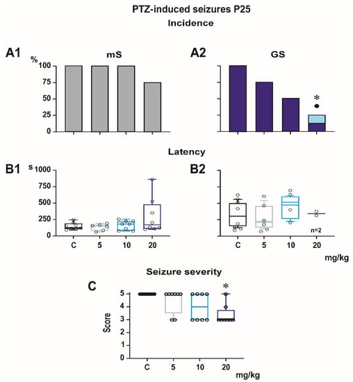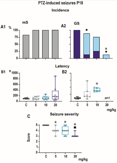 A total of 98 animals were used in this experiment (P 12 (n = 32), 18 (n = 40), and 25 (n = 34)). At the dose of 100 mg/kg used in our study, PTZ elicits two types of convulsive seizures, which differ by developmental profile, seizure generator, and by pharmacological sensitivity. Appearance of minimal (mS, mostly clonic convulsions involving head and forelimb muscles with preserved righting reflexes) seizures is age-dependent. They are regularly elicited by PTZ in P15 and older animals but not in younger rats []. In contrast, generalized tonic-clonic seizures (GTCS), starting with short running phase and accompanied by a loss of righting reflexes, can be induced already in P1 rats [].