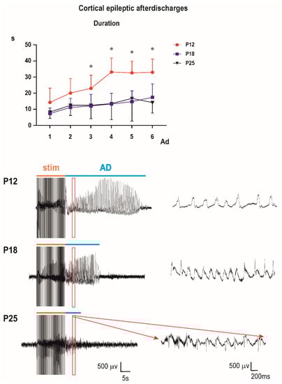 Age-related differences in duration of epileptic cortical afterdischarges (ADs) in control animals. Since the third stimulation, duration of ADs was significantly longer in P12 animals compared to P18 and P25 rats. Data are presented as a mean ± SD (upper part of the figure). * Mean significant difference of values in P12 from corresponding ADs in the other two age groups.