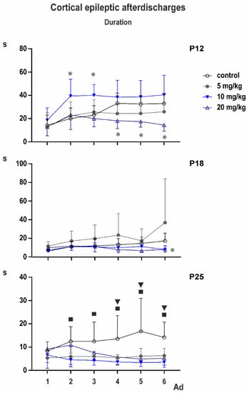The bottom part of the figure shows examples of original EEG recordings of the third afterdischarges (ADs) in the three age groups (P12, P18, and P25 from top to the bottom). Note the difference in EEG pattern between P12 rats and older animals (right bottom part of Figure 4). There are no spikes in 12-day-old rat pups; AD is formed by sharp waves. Examples represent third second of the third ADs in rats injected with the 10-mg/kg dose of PEAQX (in red frame). Time and amplitude scales are on the bottom.