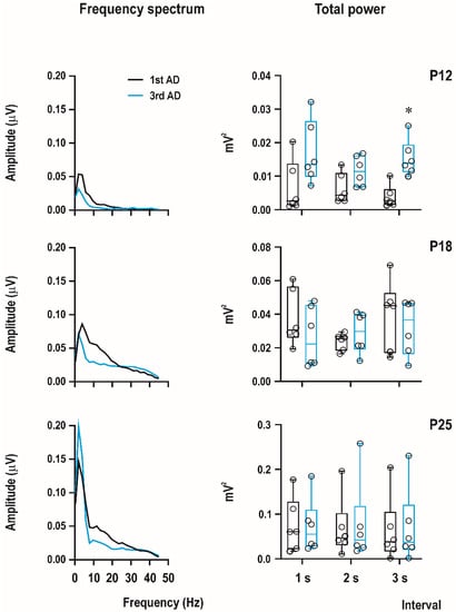 An example of computer analysis of EEG recordings. Comparison of the first three seconds of the first, pre-drug AD (black lines) and the third, post-drug AD (blue lines). PEAQX (10 mg/kg) was administered 5 min after the end of the first AD. Left part of the figure shows frequency spectrum (fast Fourier transform analysis) from all age groups used (from top to bottom P12, P18, and P25). X axis—frequency of EEG waves (Hz), y-axis—amplitude in µV. Right part of the figure illustrates total power in the first three seconds of ADs (x-axis). Y-axis—power in mV2. Data are shown as box plots (min to max) with individual values (circles). Asterisk denotes significant difference in total power between interval-matched control and PEAQX groups.
