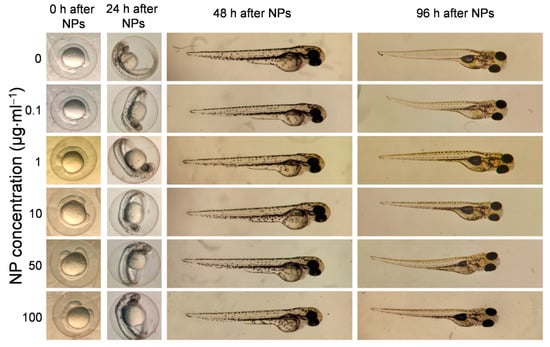 - Pham, D.H.; De Roo, B.; Nguyen, X.B.; Vervaele, M.; Kecskes, A.; Ny, A.; Copmans, D.; Vriens, H.; Locquet, J.P.; Hoet, P.; et al. Use of Zebrafish Larvae as a Multi-Endpoint Platform to Characterize the Toxicity Profile of Silica Nanoparticles. Sci. Rep. 2016, 6, 37145. [Google Scholar] [CrossRef]