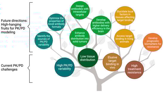 The fruit tree model presents the current challenges and future directions for modeling the pharmacokinetics/pharmacodynamics (PK/PD) of therapeutic antibodies. PK/PD modeling has been widely used to overcome the challenges associated with antibodies, including high PK/PD variability, low tissue distribution, elusive target binding in vivo, and high treatment resistance (enclosed in solid lines). This review discussed the future directions for PK/PD modeling in antibody development, namely the “high-hanging fruits” for PK/PD modeling (enclosed in dash lines). PK = Pharmacokinetics; PD = pharmacodynamics.