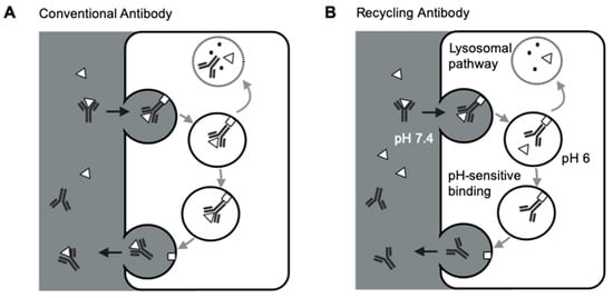 Several groups demonstrated the strategies of increasing FcRn binding to extend antibody half-lives and reduce antibody therapeutic doses [,,]. However, such an approach is still limited by antibody-mediated antigen accumulation, restricting the targetable range of antigens for conventional antibodies. Igawa and colleagues have proposed the concept of recycling antibodies to overcome antibody-mediated antigen accumulations. The recycling antibody has a pH-dependent binding affinity to their cognate antigens, which decreases at pH 5.5–6.0 and remains mostly unchanged at pH 7.4 []. Therefore, the recycling antibodies can release antigens in the endosomes for lysosomal degradation, and the antibodies can be recycled back to the cell surface (Figure 2B). This approach can make antibodies bind to their pathogenic antigens multiple times []. Sweeping antibodies further improved the efficiency of removing pathogenic antigens by enhancing their affinities towards FcRn and increasing the antibody-antigen complex’s cellular uptake into endosomes [,]. Various clinical studies have demonstrated the safety and efficacy of such novel antibody formats [,,]. For instance, ravulizumab, a sweeping antibody developed from eculizumab, had a terminal half-life 4-time longer than eculizumab. Ravulizumab achieved noninferiority for all efficacy end points when given to the patients every eight weeks compared with eculizumab given every two weeks [,].