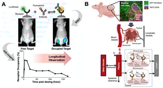 Elucidating antibody-target binding dynamics in the living system. (A) A bioluminescence resonance energy transfer (BRET) imaging method continuously and noninvasively monitor antibody-target interactions in the living tumors. A bright luciferase, NanoLuc, was fused to EGFR as the BRET energy donor. When cetuximab binds to EGFR in solid tumors, the distance between stimulated NanoLuc and DY605 (fluorophore) enables the resonance energy transfer from stimulated NanoLuc to DY605-cetuximab. DY605 emissions from living tumors directly visualized the interactions between cetuximab and EGFR (Adapted from abstract graph [], Cell Press, 2019). (B) A spatially-resolved model characterizes antibody-target binding dynamics in living tumors. The tumor is divided into two compartment (the stroma-rich vs. stroma-poor tumor area), and the model assumes antibody binds to its target at different dynamics in two compartment, which well recapitulated the longitudinal imaging data (Adapted from Figure 2 [], Nature Research, 2020).