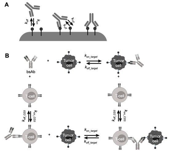Modeling approaches can also help determine the binding properties associated with the optimal pharmacological effects of novel antibody formats. A certain threshold of target expression is required for the optimal avidity of bsAbs, which can be different for each antigen [,]. Simultaneous binding of both bsAb arms will only happen when the second receptor is in the first receptor’s vicinity, which greatly influences the avidity of bsAbs. Rather than assuming each arm of a bsAb binding to targets independently with monovalent binding kinetics parameters (Figure 5A), many modeling studies have provided insights into improving bsAb avidity by simulating the antibody crosslinking events with different individual arms’ affinities and target expression levels [,]. The influences of the spatial limitation on bsAb bivalent binding were also evaluated in mechanism-based models, either on the same cell surface [,,] or on different cell surfaces [,]. Those studies provided a deeper understanding of the factors that regulate bsAb dual-targeting properties to aid bsAb engineering and selection efforts.