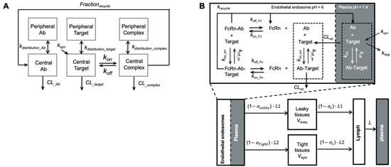Modeling recycling antibodies. (A) A target-mediated drug disposition (TMDD) modified to include a fraction of recycling. The model included the distribution kinetics of recycling antibodies, pathogenic targets, and antibody complexes between the central and peripheral compartments. The antibody-target binding was only considered in the central compartment. Frec described the FcRn-mediated recycling, the fraction of antibody recycled from endosome (Adapted modified from Figure 1 [], Elsevier, 2016). (B) A minimal-PBPK model with a nested endosomal compartment describing the binding kinetics of recycling antibodies. The antibody-target binding was included in both plasma (shadowed) and endosome compartments. FcRn-mediated antibody recycling was considered in the endosome compartment. (Adapted from Figure 1 [], Springer Science, 2018).
