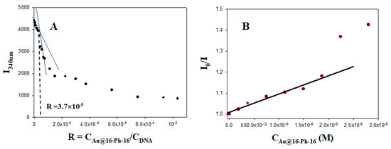 Fluorescence experiments with the DNA/5-Fu (5-fluorouracil) system in the presence of different CAu@16-Ph-16 at 298.0 K in a cacodylate buffer (ionic strength (I) = 1.63 mM and PH = 7.4); C5-Fu = 41.7 μM and CDNA = 50.0 μM. (A) Plot of I340 nm versus the molar ratio, R = CAu@16-Ph-16/CDNA (B) Stern–Volmer plot of DNA/5-Fu system at different CAu@16-pH-16.