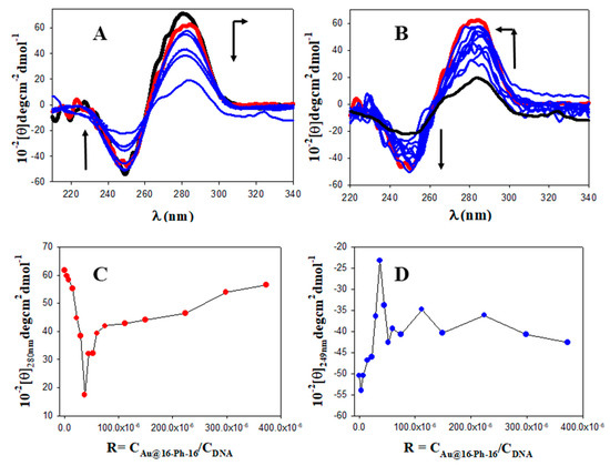 Circular dichroism (CD) titrations of the DNA–5-Fu system at different CAu@16-Ph-16 in a cacodylate buffer (I = 1.63 mM and PH = 7.4); C5-Fu = 41.7 μM and CDNA=50.0 μM. The CD spectra of free DNA and the DNA/5-Fu complex in black and red, respectively. (A) First behaviour; arrow indicates change 0, 0.187, 0.373, 0.747, 1.49, and 1.87 nM of Au@16-Ph-16. (B) Second behaviour; arrow indicates change 1.87, 2.24, 2.61, 2.98, 3.73, 5.60, 7.47, 11.2, 14.9, and 18.7 nM of Au@16-Ph-16. (C,D) Plots of (θ)280 nm and (θ)249 nm (the maximum and minimum CD molar ellipticity) versus R, respectively. Dot symbols correspond to experimental data and solid lines to trend lines.