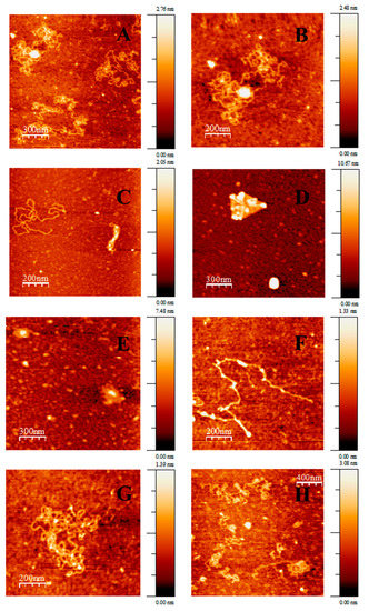 AFM topography images of DNA/5-Fu and Ci complexes adsorbed on 3-aminopropyltriethoxilane (APTES)-modified mica surface in a cacodylate buffer (I = 1.63 mM and pH = 7.4; CDNA = 0.3 μM, C5-FU = 0.25 μM) under different reaction conditions: (A,B) DNA/5-Fu complex, CAu@16-Ph-16 = 0 pM. (C) Intermediates of compaction; CAu@16-Ph-16 = 1.10 pM. (D,E) Ci complexes at a compact stage; CAu@16-Ph-16 = 11.1 pM. (F,G) Intermediates of decompaction; CAu@16-Ph-16 = 34.0 pM. (H) Ci complexes at the decompacted stage; CAu@16-Ph-16 = 50.0 pM.
