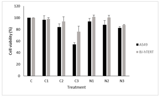 Cell viability for Ci and Ni formulations in A549 cancer cells and healthy BJ-hTERT cells. C is designated as the control, and it corresponds to cells without treatment.