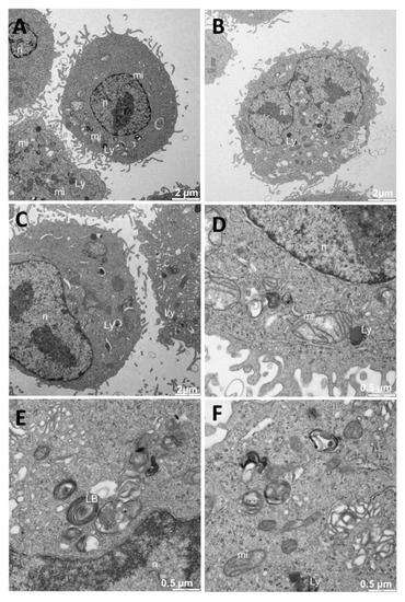 To gain insight into the behavior and effectiveness of Ci and Ni nanoparticles in cancer and normal cells, the cellular uptake of different nanosystems was studied. Below, we describe the results of the experiments carried out with TEM and confocal microscopy exploring the internalization of the nanosystem. First, we carried out experiments with the different Ci and Ni formulations using TEM. This microscopy technique permitted the visualization of the organelles, and it could serve to verify the presence or absence of nanoparticles inside the cells. In the study carried out on A549 cells without any treatment, we observed that the cells had organelles typical of the type to which they belonged (see Figure 6). Some vesicles were visualized, though without dense bodies inside. Since A549 cells were compatible with those of type II pneumocytes, they showed the presence of lamellar bodies (Figure 6E), a fundamental component in the synthesis of lung surfactants. Numerous mitochondria (mi) were observed to be quivering. Moreover, vesicles with dense content compatible with lysosomes (Ly) were present (Figure 6A–F). There were no dense bodies outside either, and the appearance of the cells was completely normal considering their typology; therefore, it corresponded to a negative control.