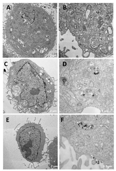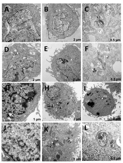 With regard to the treatment with free Ni nanoparticles at different CAu@16-Ph-16, the images clearly show the presence of Au@16-pH-16 gold nanoparticles (Figure 7A,B,D,F). To ensure the presence of dense particles compatible with gold nanoparticles and to effectively distinguish them from other particles, low contrast photos in which small elements such as ribosomes were blurred but the dense particles remained clearly visible, were taken. In cells treated with the N1 precursor, dense bodies are shown in vesicles (v) (Figure 7A,B). In addition, vacuoles, and lamellar bodies (LBs) can be observed.