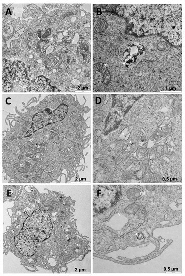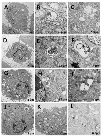 In the tests carried out with different formulations of the Au@16-Ph-16/DNA–5-Fu-compacted nanosystem on BJ-hTERT cells, most of the cells presented a nucleus with normal morphology (Figure 10A–F). In some cells, dense bodies were observed on the surface, encompassed in vesicles that were compatible with nanoparticles, but it was not possible to distinguish whether they were entering or leaving (Figure 10F). Such structures were also dispersed throughout the cell cytoplasm without being contained in vesicles (Figure 10D). In all the treatments, the appearance of the mitochondria was normal (Figure 10A–F). However, in most of the cells, the number of mitochondria was much higher compared to the untreated cells (Figure 10C,E), which also occurred in cells treated with the Ni-free nanoparticle (Figure 10D,G,K).