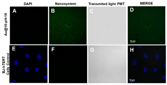 In the treatment of BJ-hTERT cells with Au@16-pH-16 (Figure 12), nanoparticles were observed in the cells at 0 h in small amounts (Figure 12A–D), becoming more evident at 24 h after performing treatment (Figure 12E–H). It seems that the nanoparticles may have been rapidly internalized in some cells. Structures compatible with nanosystems were also observed outside the cell, again more evident at 24 h (Figure 12B,F). To establish a control over the internalization time, a sampling was carried out ranging from 1 to 24 h by means of confocal microscopy control (Supplementary Materials Figure S20) that showed that at all times, there was a gradual entry of cells as a function of time, which was more evident in the fractions that went from 8 to 24 h.