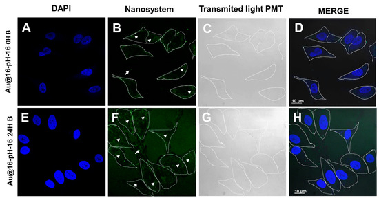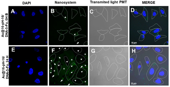 The administered treatments were Au@16-pH-16 (Figure 12) and Au@16-Ph-16/DNA–5-Fu (Figure 13) at 0 and 24 h. In the positive control (Figure 11A–D), the dispersed distribution of the nanoparticles was observed throughout the slide. As a negative control, the cells were not treated with any nanosystem (Figure 11E–G); only a DAPI fluorochrome counterstain specific for cell nuclei was used. As shown in the figures, no structures that were compatible with nanoparticles were observed; only cell nuclei stained with DAPI were evident (Figure 11E,H).