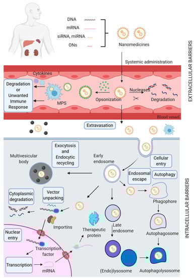 The biological barriers for non-viral gene delivery systems. Nucleic acids (e.g., DNA, mRNA, siRNA, miRNA, and oligonucleotides (ONs)) are usually incorporated into nanoparticles (NPs) to modulate protein expression levels. Extracellular (EC) barriers include: (i) the clearance through the kidney, liver, and spleen; (ii) the mononuclear phagocyte system (MPS), activated through the opsonization of the nanoparticles, with nucleases degrading the genetic cargo and finally, (iii) extravasation. Once EC barriers are circumvented, NPs must face intracellular (IC) barriers: Firstly, the plasma membrane must be crossed, usually by endocytic pathways, to ensure cellular entry. Next, NPs are encapsulated into an endosomal vesicle, which keeps them physically separated from the cytosol. Endosomal routes must be suppressed to avoid the lysosomal action responsible for degrading the internalized cargo and consequently its inability to gain access to the cytosol. Another challenge includes avoiding being recycled back to the EC environment. Once the cytosol is reached, the internalized NPs face autophagy and cytoplasmic degradation. Finally, pDNA must overcome the nuclear envelope to be delivered into the nucleus. Figure based on the work of Vermeulen et al. and Okholm et al. [12,13]. Created with BioRender.com.