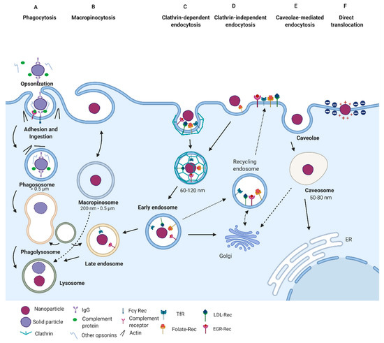 Mechanisms of internalization in living cells. (A) Phagocytosis; (B) Macropinocytosis; (C) Clathrin-dependent endocytosis; (D) Clathrin-independent endocytosis; (E) Caveolae-mediated endocytosis; (F) Direct translocation. Other conventions: IgG, Immunoglobulin G; Fcγ Rec, Fcγ receptor; TfR, Transferrin receptor; Folate-Rec, Folate receptor; LDL-Rec, low-density lipoprotein receptor; EGF-Rec, Epidermal growth factor receptor; ER, Endoplasmatic reticulum. This figure was based on Yameen et al. and Hillaireau et al. [48,49]. Created with BioRender.com.