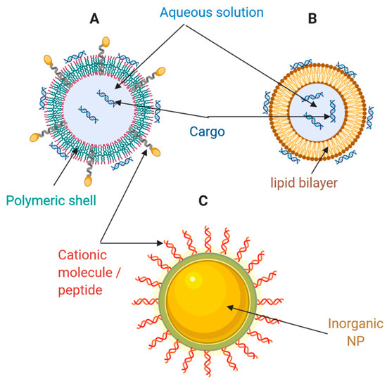 Schematic of different types of nanocarriers for drug and gene delivery. (A) Polymeric nanoparticle; (B) Liposome; (C) Inorganic nanoparticle. Adapted from Weng et al. [90], Molecular Therapy Nucleic Acids, 2020.