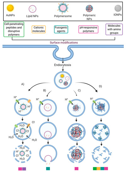 Strategies to improve the endosomal escape ability of some nanocarriers. This schematic illustrates the association between the more typically employed surface modifications and the endosomal escape mechanisms (EEMs): (A) Proton-Sponge and osmotic lysis; (B) Membrane fusion; (C) Particle swelling, and (D) Membrane translocation and destabilization. The color legend below the EEMs corresponds to the surface modifications that likely trigger the corresponding EEM. Created with BioRender.com.