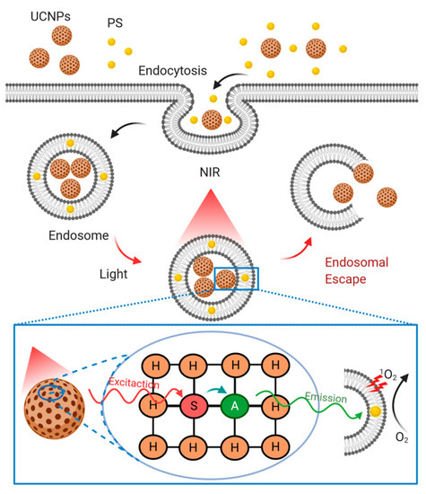 Lanthanide-doped upconversion nanoparticles (UCNPs) follow a photochemical internalization to achieve endosomal rupture and subsequently delivery of carried biomolecules as schematized in Figure 5. UCNPs are typically composed of trivalent lanthanide dopant ions embedded in a host lattice, which is expected to match dopant ions to yield low phonon vibration energies and excellent chemical stability [8]. Fluorides and oxides have been the most commonly used host lattices for Ln-doped UCNPs. Particularly, fluoride-based (e.g., NaYF4) UCNPs have been identified as an efficient alternative due to their low phonon vibration energy [8]. The luminescence efficiency of Ln-doped UCNPs has been improved by incorporating two types of dopant ions. One of them emitting visible light (activator) while the other acting as an energy donor (sensitizer) (Figure 5). Yb3+ is usually selected as a sensitizer due to its high absorption coefficient and upconversion efficiency, while Er3+, Tm3+, and Ho3+ are generally the choice for activators [8]. The emerging interest in UCNPs arises from better tissue penetration by near-infrared (NIR) compared with visible light excitation, thereby enabling deep tissue applications. Moreover, UCNPs show excellent stability against photobleaching and photochemical degradation, making them attractive for a range of biomedical applications, including cancer therapy, bio-labeling, fluorescence, magnetic resonance imaging, and drug delivery [162,163].