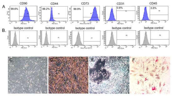 Surface marker expressions and differentiation potential of rabbit bone-marrow-derived stem/stromal cells (BMSCs). (A) BMSCs were separately incubated with each surface marker antibody at 4 °C for 30 min and subjected to flow cytometry analysis. Histogram showing the intensity corresponding to the positive staining of each cell surface marker. (B) Histogram showing the intensity of the isotype control. The BMSCs displayed a phenotype profile of CD90+ CD44+ CD73+ CD31− CD45−. (C) Passage 2 adherent BMSCs cultivated in standard culture medium were found to exhibit a fibroblast-like morphology. (D) Alizarin red staining, (E) Alcian blue staining, and (F) Oil red O staining of BMSCs after osteogenic, chondrogenic, and adipogenic induction for 21 days, respectively.