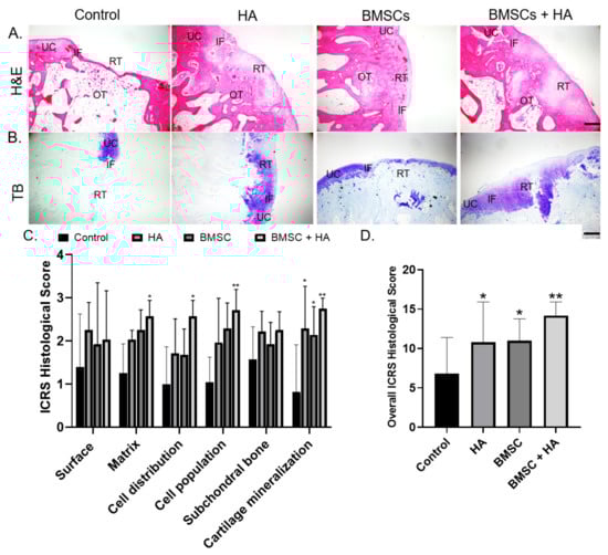 The histological images of each group were analyzed using hematoxylin and eosin (H&E) and toluidine blue (TB) stains, specifically classified into four distinct zones: unoffended cartilage (UC), cartilage interface (IF), repair area (RT), and osteochondral interface (OT). Figure 5A,B shows the representative photomicrographs of H&E (upper panel) and TB (lower panel) staining of each group. In the control group, the articular condyle was concave with a discontinuous surface over the defect site, showing no sign of cartilage regeneration. In contrast, significantly more regenerated cartilaginous tissues was found filling the defects in the treatment groups (HA, BMSCs, and combined BMSCs and HA). Moreover, the repair tissue was adequately integrated with the adjacent native cartilage and subchondral bone. Figure 5B shows repaired regions stained with TB. Limited repair tissue could be noted in the controls, which was negatively stained for TB. These results were consistent with H&E observations, indicating superior healing results in the treatment groups compared to controls. Interestingly, there was a difference in TB metachromasia among treatment groups. As shown in Figure 5B, compared to isolated HA and combined BMSC and HA groups, repaired regions in the isolated BMSC group consisted primarily of fibrous tissue that was negatively stained for TB. Quantitative analysis with the International Cartilage Repair Society (ICRS) histological scoring revealed that histological evaluation of the repaired tissue was the best in the combined BMSC and HA group (14.75 ± 1.8), followed by isolated HA (12.28 ± 3.5) and BMSC (11.5 ± 3.4) groups (Figure 5C,D).