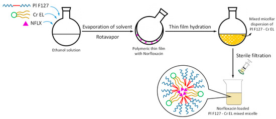 Schematic representation of the obtaining procedure for the Norfloacin loaded Pluronic F127—Cremophor EL mixed micelles.