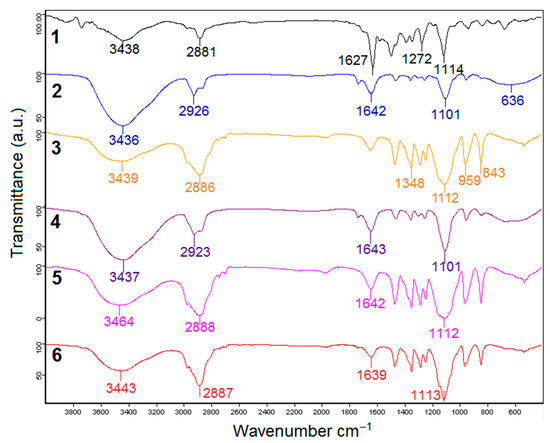 FTIR spectra of (1) Norfloxacin, (2) Cremophor EL, (3) Pluronic F127, (4) Norfloxacin in Cremophor EL micelles 100 µg/mL, (5) Norfloxacin in mixed micelles Cremophor EL-Pluronic F127 and (6) Norfloxacin in Pluronic F127 micelles 100 µg/mL.