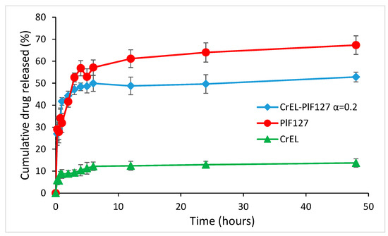 In vitro drug release profile for NFLX in Cremohor EL, Pluronic F127 and CrEL-Pl F127 (α = 0.2) mixed micelles.