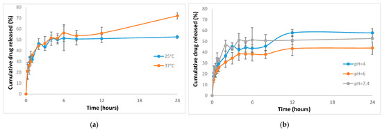 The influence of the temperature and pH of the media on drug release was tested and the experiment were performed at 25 °C and 37 °C, in PBS buffer with pH values of 7.4, 6 and 4.