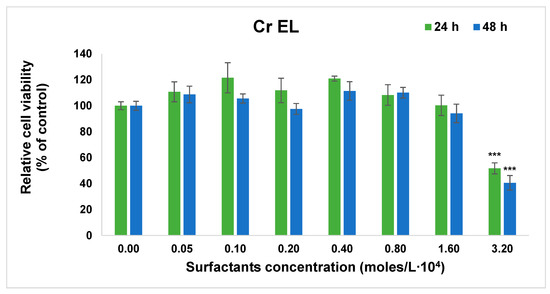 As shown in Figure 6, the Cremophor EL micellar solution in the range 5 × 10−6–2 × 10−4 M did not affect the number of viable cells after 24 h of incubation compared with the control. Although no change in cell viability was measured for sample Cremophor EL even at concentration approximative 5 times higher the CMC, a significant decrease was noticed for the 3.2 × 10−4 M concentration, after both time intervals of incubation with surfactants.