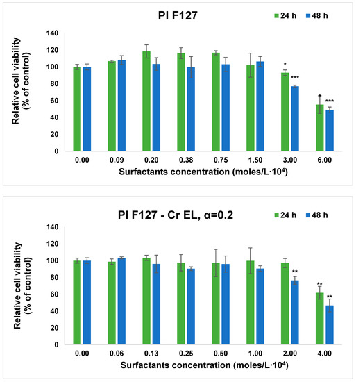 The micellar dispersions based on Pluronic F127 show lack of cytotoxicity up to 1.5 × 10−4 M, as it is reported in most paper for low concentrated polymeric solutions below 8 × 10−6 M, in premicellar region [42]. An unexpected dose-dependent decrease was obtained for Pluronic concentrated micellar disperions from 3 × 10−4 M to 6 × 10−4 M, where the cellular viability decreased to 49% compared to control value after 48 h of exposure.