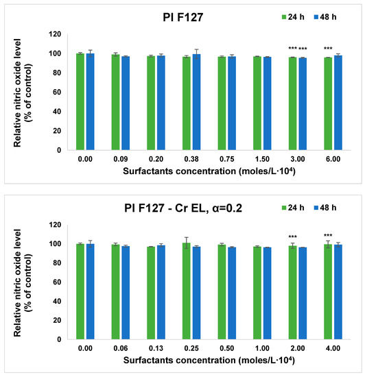 The amount of NO released in the culture medium was assessed as a valuable indicator of inflammation produced by the contact with surfactant solutions in premicellar and micellar regions. As it is shown in Figure 7, no significant changes in NO release after cell exposure to surfactants over whole range of studied concentrations could be observed. Thus, it was concluded that even in the case of the Cremohore EL presence, the surfactant micelles did not induce inflammation in human fibroblast cell cultures.