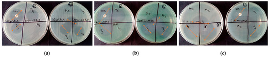 The antimicrobial assays were performed using standard and clinical bacterial strains that were included in the microbial collection of University of Bucharest, Faculty of Biology, Microbiology Department: Staphylococcus aureus ATCC 25923 and Staphylococcus aureus MRSA clinical strain, Enterococcus faecalis ATCC 29213 and Enterococcus faecalis VRE clinical strain, Pseudomonas aeruginosa ATCC 27853 and Pseudomonas aeruginosa 5399 clinical strain, and Escherichia coli ATCC 25922 and Escherichia coli ESBL 135 clinical strain. To perform the experiment, two successive passages were made by passing the microbial strains on nutritious agar medium and incubating for 24 h, at 37 °C.
