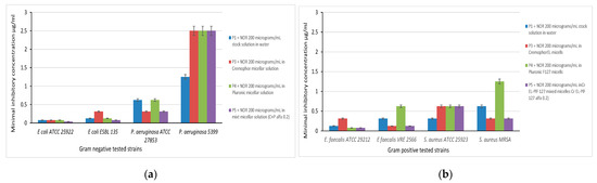 Graphic representation of minimal inhibitory concentration values for: (a) Gram negative tested strains and (b) Gram positive tested strains.