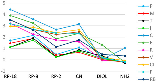 The RM value was the next parameter that was calculated and analyzed (Tables S2 and S3). It was found that the RM values decreased with the increasing amount of organic modifier in the mobile phase in all cases. The highest RM data were recorded on RP-18, and the lowest on the silica gel modified with DIOL and NH2 groups.