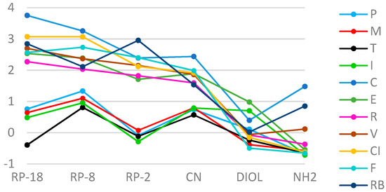 Based on the linear dependence of RM on the concentration of Met or Ac in the mobile phase for the tested compounds, the RM0 values were determined by extrapolation of the organic modifier in these systems to the zero concentration. Obtained values were subjected to statistical evaluation and a correlations were established (Tables S4 and S5). The obtained regression coefficients for all systems were usually higher than 0.94. Lower correlations may be associated with the various retention interactions that the studied stationary phases may exhibit. The determined values of the RM0 parameter, which is a measure of the lipophilicity of the substance, differ from one another. They depend on the chemical structure of individual compounds (the cyclicity of the molecule, length of the carbon chain, presence of specific groups of atoms or substituents), and also on the properties of the system (stationary and mobile phases). The higher the RM0 value, the greater the lipophilic character of the substance. RM0 values for the tested oxicams ranged from −0.2693 to 2.1593, while for coxibs, higher values ranging from −0.2205 to 4.4357 in Met/water and from −0.6517 to 3.7555 in Ac/water were obtained. The lowest RM0 values were obtained for I and M. The highest values of these parameters were observed for P. In the coxib group, the lowest RM0 was obtained for R and RB, and the highest for C.
